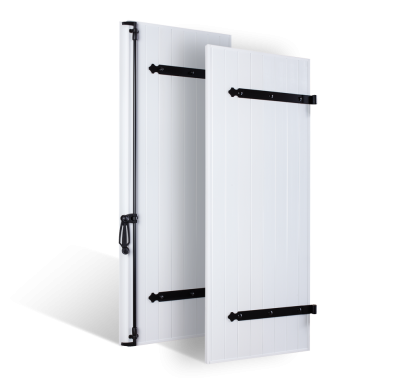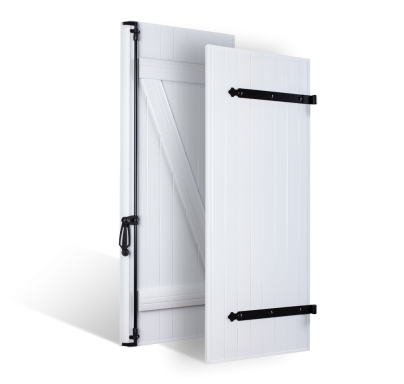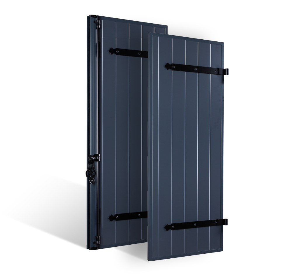 Renforts métalliques verticaux pour les coloris unis. 2 renforts par vantail pour donner plus de rigidité aux panneaux. (les raidisseurs sont prévus en base dans les volets plaxés ton chêne)