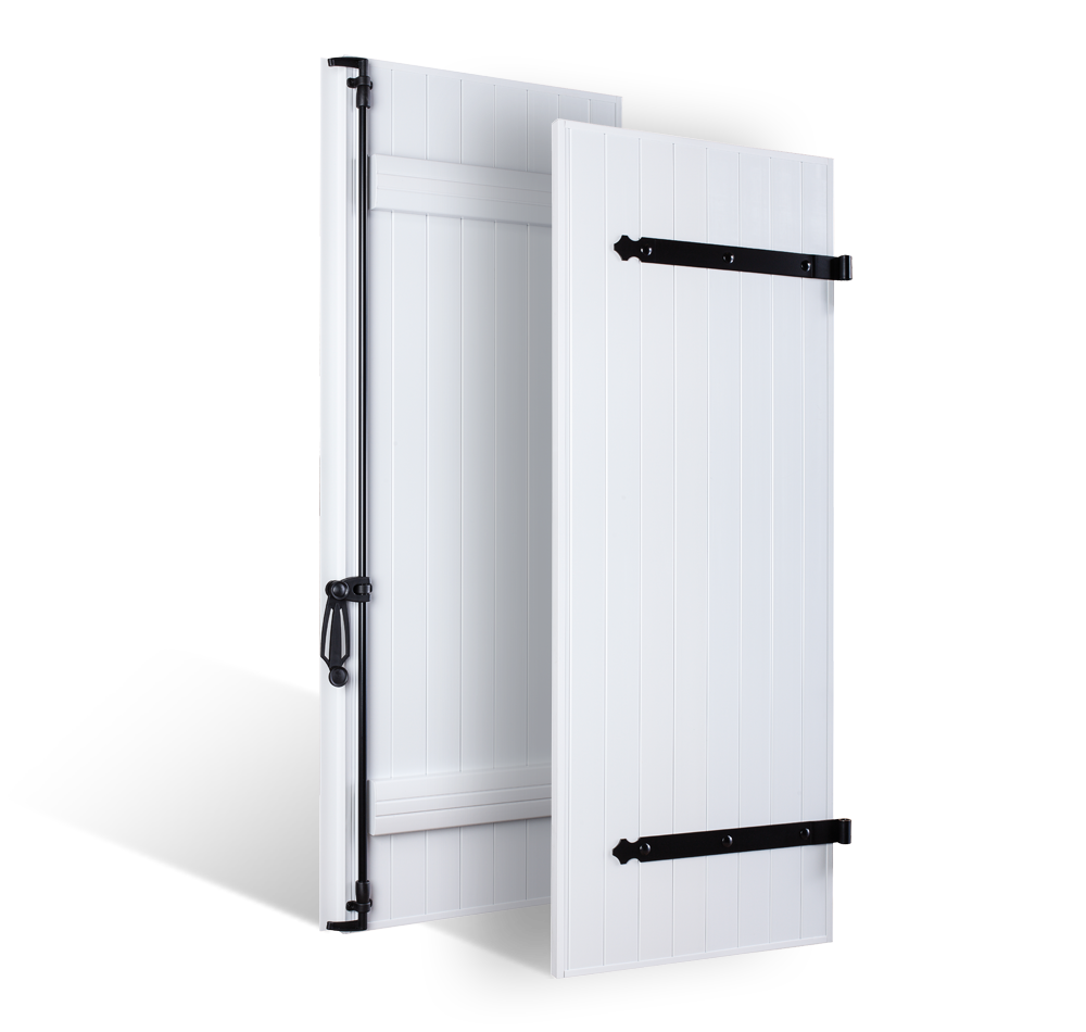 Volet battant à lames verticales en PVC, décor barres seules. Il est composé d'un panneau PVC rainuré. Fabriqué en France.